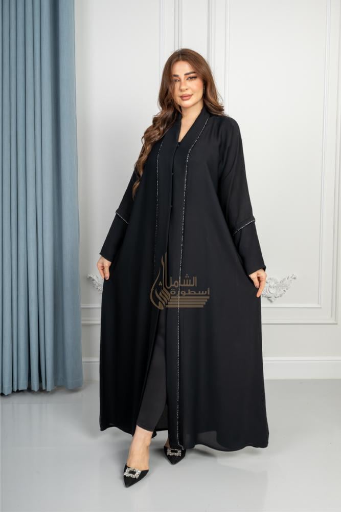 عباية بياقة طويلة مطرزة بخط فضي أنيق، تتميز بخط زينة على الأكمام مع تفاصيل دقيقة من الفصافص، لإضافة لمسة فاخرة وجذابة.